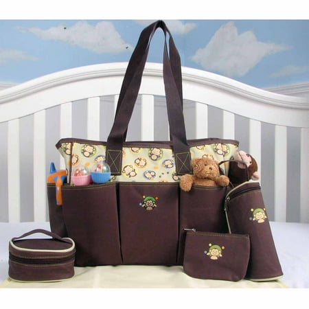 SOHO Curious Monkey 5-in-1 Deluxe Diaper Tote Set: Extra roomy main compartment with multiple pocketsReliable zip-top closurePadded changing stationSmall accessory caseInsulated zippered bottle bag, fits any size bottleFood diaper bag with zip closure and carrying strapQuestions about product recalls? Items that are a part of a recall are removed from the Walmart.com site, and are no longer available for purchase