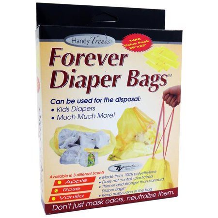 Handy Trends 14 Pack Forever Diaper Bags- Made from 100% polyethylene- Does not contain plasticizers- Thinner and stronger than standard diaper bags- Keeps nasty odors in the bag- Don't just mask odors, neutralize them- Can be used for the disposal of kids diaper and much, much more! Rose scented- 14 bags measuring 29 in x 23 in- Case pack: 12 - 14 pack boxes- SKU: DLRDY213628
