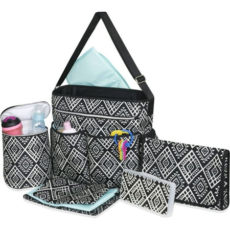 Tender Kisses Black Geometric 8pc Diaper Bag Super Set:8 piece setInsulated bottle bagLarge front zip pocket3 zip pouchesDiaper clutch includedAdjustable shoulder strapMatching wipe case includedChanging pad includedInterior and changing pad easily wipe cleanDiaper bag has exterior dimensions: 14" height x 14" wide x 5" depthInsulated bottle bag has exterior dimensions: 8-1/2" height x 7" wide x 4-1/2" depthPouches to help Mom stay organized: Small has exterior dimensions of 6" height x 9" wideMedium has exterior dimensions of 7" height x 10-1/2" widthLarge has exterior dimensions of 8" height x 12" wideDiaper clutch has exterior dimensions of 8" height x 2-1/2" wideChanger has dimensions: of 12" height x 12" wideMicrofiberQuestions about product recalls? Items that are a part of a recall are removed from the Walmart.com site, and are no longer available for purchase