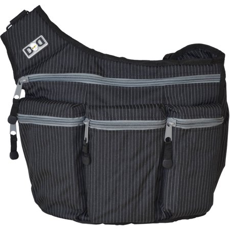 Diaper Dude Messenger I Diaper Bag, Black Pinstripe: Stroller strapDurable polyester stands up to everyday useErgonomic, across-the-chest design is super comfy and saves your shouldersWide, adjustable strap has padded panel and clips open and closed for easy on and offPadded back for extra comfort against your body3 exterior zip-closed pockets are perfect for wipes, bibs, food and moreElasticized bottle pocket is easy to reachLarge inner compartment with zip-closed pocketPadded changing pad included2 large elasticized slots in backQuestions about product recalls? Items that are a part of a recall are removed from the Walmart.com site, and are no longer available for purchase